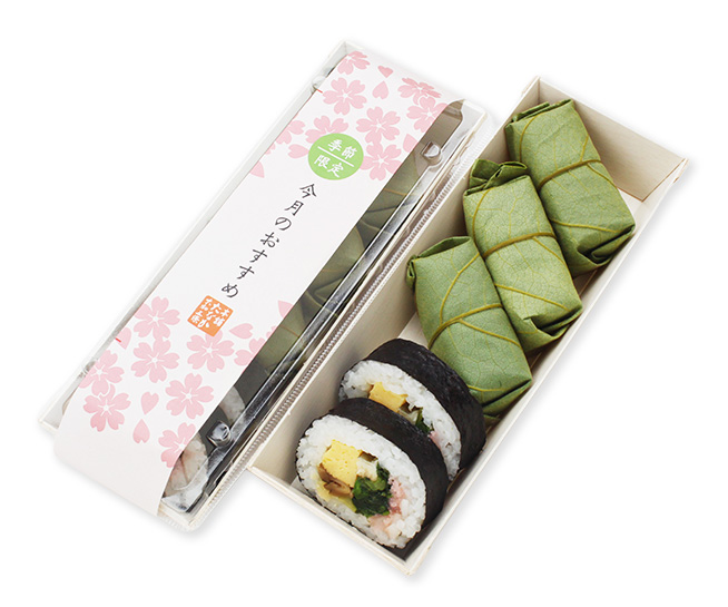 3月は「柿の葉すしと春ののり巻セット」と「山菜の柿の葉すし」がおすすめ。